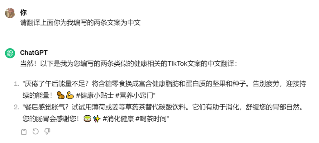 第三步:我们把上面短视频的文案复制下来,进入chatgpt让他帮我们编写出同类的文案;进入chatgpt,把上诉的tiktok的文案先喂给gpt,可以多喂养同类的视频数据,直接上数据,gpt已经帮我把英文类似的文档生成了,看看中文是什么意思,查阅了似乎还可以。